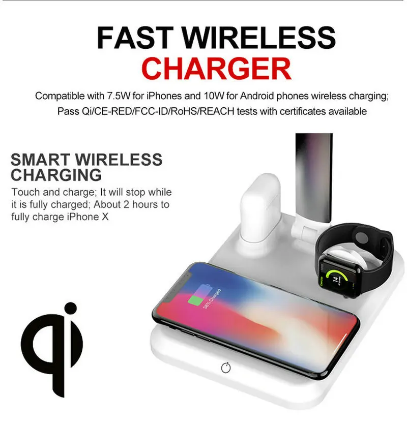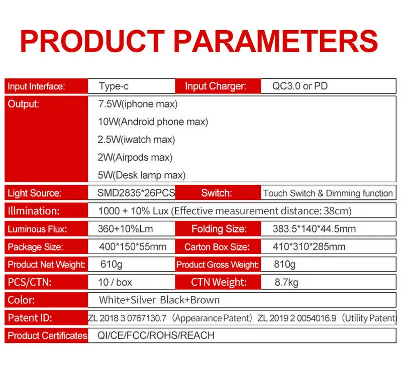 Output | 7.5W(For iPhone max) 10W(For Android phone max) 2.5W(For iwatch max) 2W(For Airpods max) 5W(For Desk lamp max) |