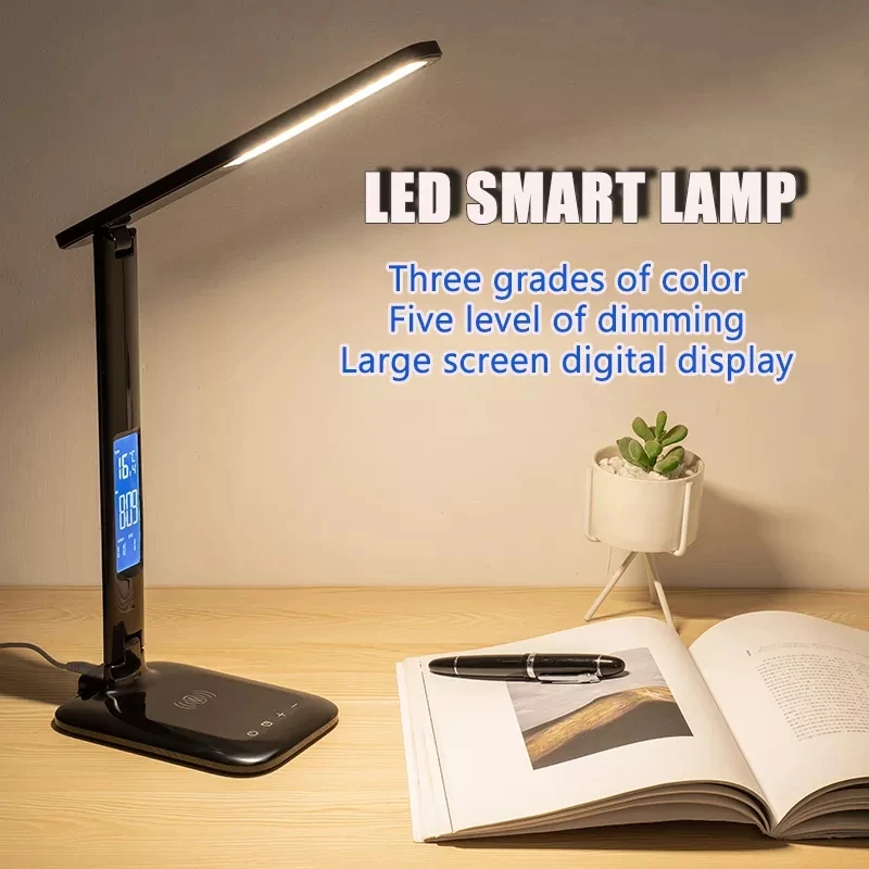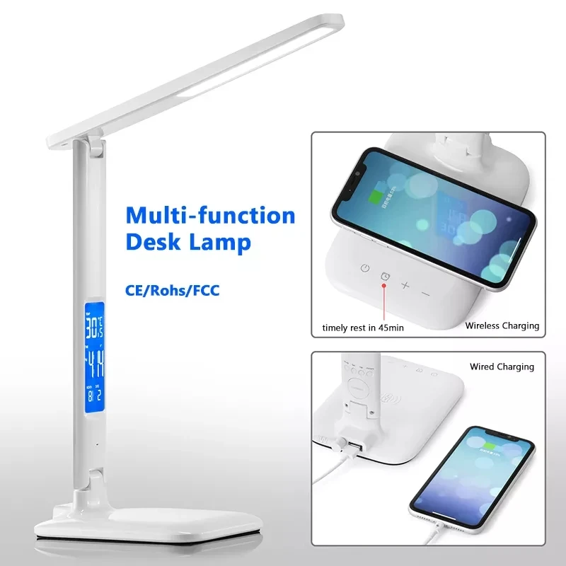Modern 15W Wireless Charging LED Table Lamp Portable ABS Body Desk Lamp with Calendar Clock LED Display for Study Office Bedroom