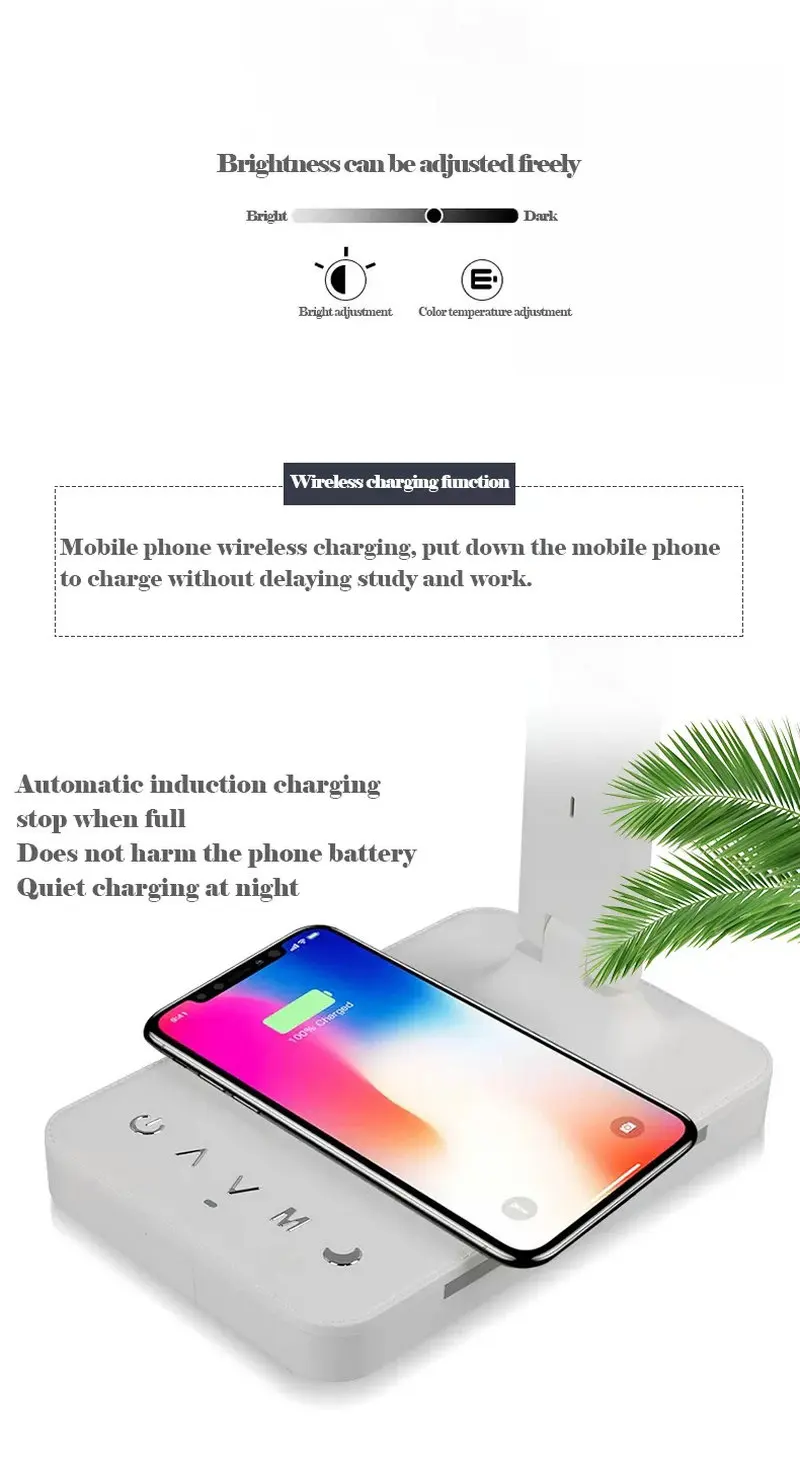* Multiple Charging Methods: Desk lamp with 10W(Max) wireless charger and 5V2.1A USB charging port. can charge your cell phone and earphone. even give power to other desk lamp.